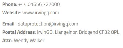 For more information on this notice or your California privacy rights contact us at +44 01656 727000, email us at dataprotection@irvingq.com or, write to us at: IrvinGQ, Llangeinor, Bridgend CF32 8PG, United Kingdom